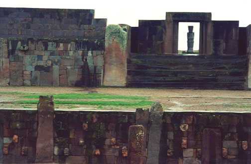 The massive size of the stones in Tiwanaku and the complex astrological alignment of the sites structures indicate that this ancient city is far older than most sources recognize. A pyramid existed here, and a striking feature of the remaining buildings is a sunken temple courtyard whose walls are lined with sculptures of protruding heads. In the foggy mist of Tiwanaku that afternoon, I was awed by the reflection of so many eyes observing my entrance into the shrouded ruins. Upon leaving the temple area, we were guided to the top of a steep, muddy hill to some monolithic stones. The footing truly felt as slippery as ice, and when I lifted each foot, a muddy apron about a foot around clung to the tread of each shoe. We were stunned to see a compass point behave erratically when placed into the magnetic fields of the stones. This anomaly was certainly due to the mineral content of the stones, and this display of earth energy was a visible reminder to me of how much our fields are also impacted by unseen planetary energies. Something as seemingly inert as a large upright stone carries within itself many levels of invisible, transformative power.
