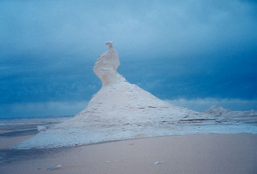 The journey began on a few rutted, paved roads, until we went directly into the sand and spent very little time on pavement. Most often it was impossible for me to understand how our driver had any idea where he was or where he was going. Occasionally there were slight ruts in the sand that disappeared in front of us just off in the distance. I'm sure he had a compass in his possession and that he navigated as much by silhouettes of the horizon as direction. We never got lost, but the worst of my concerns was realized when we did in fact get deeply stuck in the sands many miles from civilization and the last vehicle we had seen. All that surrounded us was sand, sand, and more sand. I envisioned us getting out and pushing the vehicle laboriously as a group, toiling to find presence in the sand that could have sucked us right in. I was ebullient and amazed to realize that this was not at all necessary. Our driver somehow disengaged us from the sand on several occasions using forward and backward motions in very low gears that did not even require us to exit the heavily laden vehicle. The engine groaned and the clutch caught and struggled, yet throughout the whole ordeal I couldn’t help but think that this was still better than a camel! Our driver’s skill was miraculous, and his techniques actually reminded me of the moves needed to extricate a vehicle from the snow. At our first stop before leaving paved roads, we exited the Cruiser to find a sort of trough that carried steaming hot water from one of the many local We went off-road and traveled a fairly short distance through relatively obvious tire tracks to an area that our guides called the flower desert. Many others were aware of this place; and they were all rather unceremoniously collecting the astounding black rocks that are shaped like clusters of flower buds. I asked permission before I gathered a few. The ground was positively littered with them, despite the many hands that routinely collected them. They were quite magical. Another journey through the thick and relentless desert sands brought us to our campsite for the first night. A moonscape of hills topped with coal-like black rocks surrounded us. No civilization was in sight. These sandy black hills around the area of the Bahariya Oasis are a combination of ferruginous quartzite and dolorite. The nearly white desert sand mounds and hills crowned with stark black rocks were other-worldly. Our guides made a snug camp using the Land Cruiser as a wind-break. In any amount of wind the fine sand constantly swirled around us. It found its way somehow everywhere; no orifice was spared the intrusion. Itchy ears and irritated eyes were the most obvious and unavoidable effects.