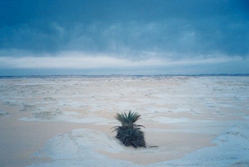 After a few hours of travel, the terrain shifted dramatically. The golden sand no longer sprouted the coal-like, sharp black rocks of the black desert. Emerging in the distance we saw ethereal, white formations whose boundaries where difficult to distinguish from the sky's brilliant white clouds. The two deserts almost bordered one another yet were exact opposites of one another. Yin and yang existed side-by-side; beautifully created by nature. The energies balanced and played off of each other. We stopped for lunch at the base of the nearly vertical hill of sand. It seemed an odd spot considering that the formidable mound totally blocked our view of the distance beyond it. Our troupe motioned for Dan and me to explore the area while they prepared our food. I needed to use the sand “facilities”, which required quite a trek to find a little privacy. When I finished my business I noticed that Daniel was nowhere to be found. The men motioned up the steep sand mountain, so I began my ascent alone.