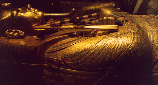 The jewelry from Tut's tomb was magnificent. They were hundreds upon hundreds of exquisitely designed gold pieces, many inlaid with precious stones, others finely painted. Solid gold boxes as large as small rooms were intricately adorned with beautiful designs and actually were originally nestled within each other like a huge golden puzzle. The magnificent and realistic golden death mask of the young pharaoh seemed the most central piece of the display; the face clearly showed that this Pharaoh died more a boy than a man.