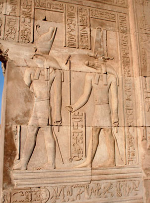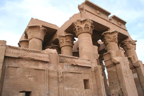 Our I explored the ship during the cruise to our first formal desination, Kom Ombo, which we were to visit the next morning. The upper deck had a small pool and comfortable chaise lounges, but its immediate appeal to me was an amazing view of the I knew that the scenes enfolding along the The visit to Kom Ombo rests in my mind as a bit of a blur. I believe I had taken in so much of Egypt and the Nile by this time that I was a bit overwhelmed and on the verge of mental exhaustion. With my mind in such an unusually quiet state, I was even more impacted by the energies that surrounded me. I do clearly remember at Kom Ombo the numerous images of Sobek, the crocodile god, as well as his falcon comrade Horus the Elder. They were repeated often throughout the complex. The riverside temple of Kom Ombo was dually dedicated to both of these ancient, human-animal deities.