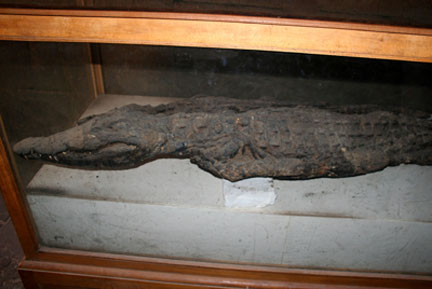 The honored status of the crocodile is ever evident at Kom Ombo. In addition to the numerous relief carvings of Sobek, many grotesque crocodile mummies were housed here, and some are still on display for curious tourists. Crocodiles were also found buried on the grounds in large numbers. They were apparently actually raised in a pool at the site, and these specimens may have been used in rituals. An eerie and unique depiction on one of the temple’s walls is a varied collection of what is usually referred to as surgical instruments. I felt they were related to the mummification process somehow. Outside of the temple complex, the