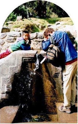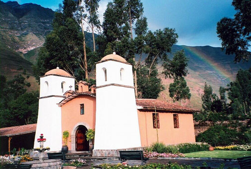 PERU, RAINBOW OVER CHURCH YUCAY Visit: Machu Picchu Photo Gallery Visit: Train: Cuzco to Puno Photo Gallery Visit: Lake Titicaca Photo Gallery After our travels that morning, we had a gourmet lunch at our hotel in the town of Yucay. As we made our way to the open air restaurant, we were blessed with an enormously beautiful rainbow that arched above the Spanish style church that was on the property . I felt deeply blessed; it was so beautiful it took my breath away. Walking the stone paths while bathed in the rainbow light felt otherwordly...the presence of Spirit was visible everywhere. My gratitude for the moment, and the exquisite beauty, filled me. We shared our table with a lovely Buddhist woman who reminded me to ask my body what foods were good for it by muscle testing throughout our travels. She noticed me hesitating at every food tray, uncertain what local delicacies to spoon onto my plate. I was bold enough, then, to sample some llama meat from the buffet. The sauce made it palatable and tender, and my body did well with it, though my mind rebelled a bit. Our food choices are definitely cultural, and I tried to stay open to "tasting" this aspect of the countries that I visited. Our Buddhist friend mentioned the Karmapa during our lively conversation. We had never heard of him, so she explained that he is the young man who is to be the Dalai Lama’s successor. She held him in extremely high regard. This began a long succession of synchronicities for us regarding the Karmapa. We actually had an audience with him when we visited Dharamsala, India, and his presence continues to come up in our lives.